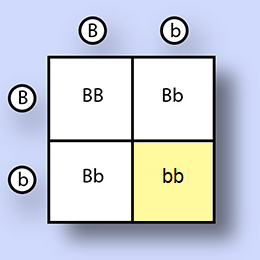 A Punnett square is a way to predict the genotype (gene allele combination) for specific traits for the offspring of specific parents. Each parent’s genotype is placed on one side of the square, and the resulting combinations are found in the boxes inside. Because some traits are dominant (only require one allele to be expressed in the phenotype, or appearance) and others are recessive (require two alleles to be expressed), the Punnett square can also be used to predict the chance of having an offspring with a certain trait. For this square, Y is the dominant allele for yellow flowers, and b is the recessive allele for blue flowers.