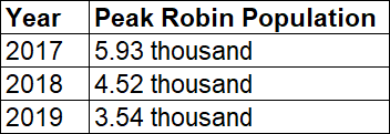 The peak Robin population for three different years is shown in the table above. When the average for these three years is calculated, the raw result is 4.663333 thousand. What should be recorded as the average population?